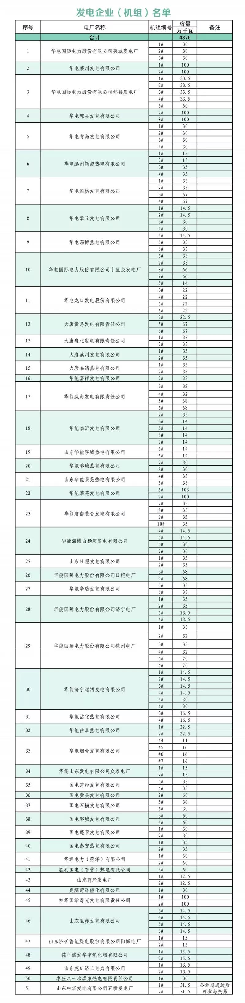 售電方:根據(jù)山東能源監(jiān)管辦下發(fā)的《關(guān)于公布2018年電力直接交易發(fā)電企業(yè)(機(jī)組)名單的通知》(魯監(jiān)能市場(chǎng)〔2017〕187號(hào))文件確定的省內(nèi)直調(diào)發(fā)電企業(yè)(詳見下表)。