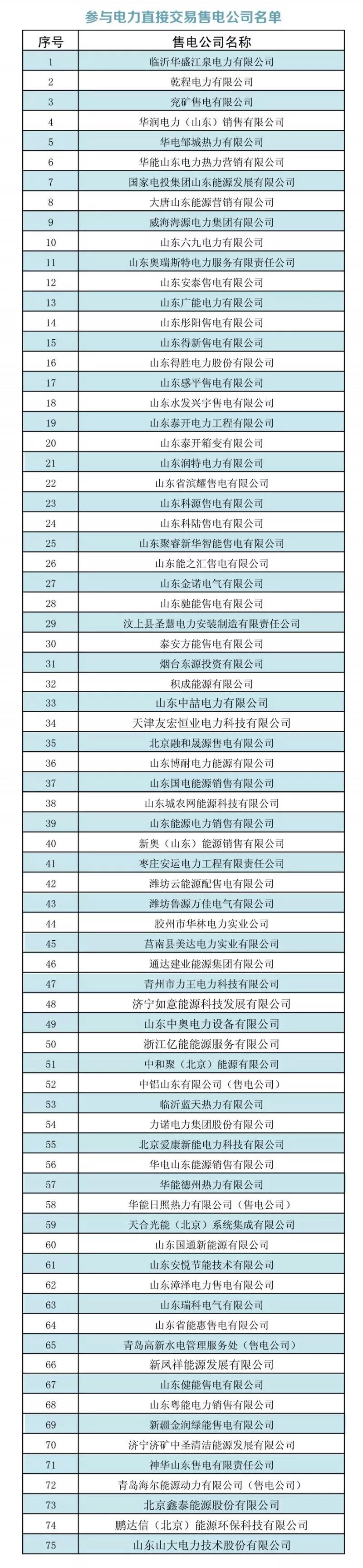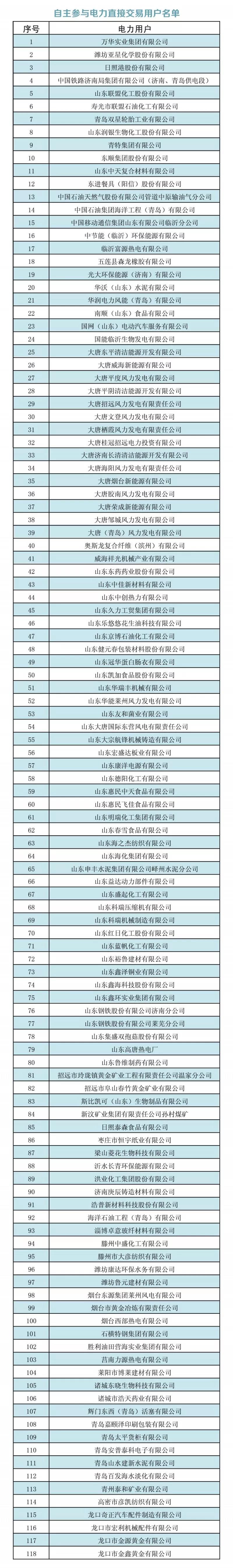 購(gòu)電方:在山東電力交易中心網(wǎng)站公示通過、完成注冊(cè)且已提交有效2018年跨省區(qū)電力用戶代理協(xié)議、省內(nèi)電力用戶代理協(xié)議的售電公司;省經(jīng)信委準(zhǔn)許并在山東電力交易中心網(wǎng)站完成注冊(cè)、可自主參與2018年跨省區(qū)電力直接交易的電力用戶和省內(nèi)電力直接交易的電力用戶(詳見下表)。