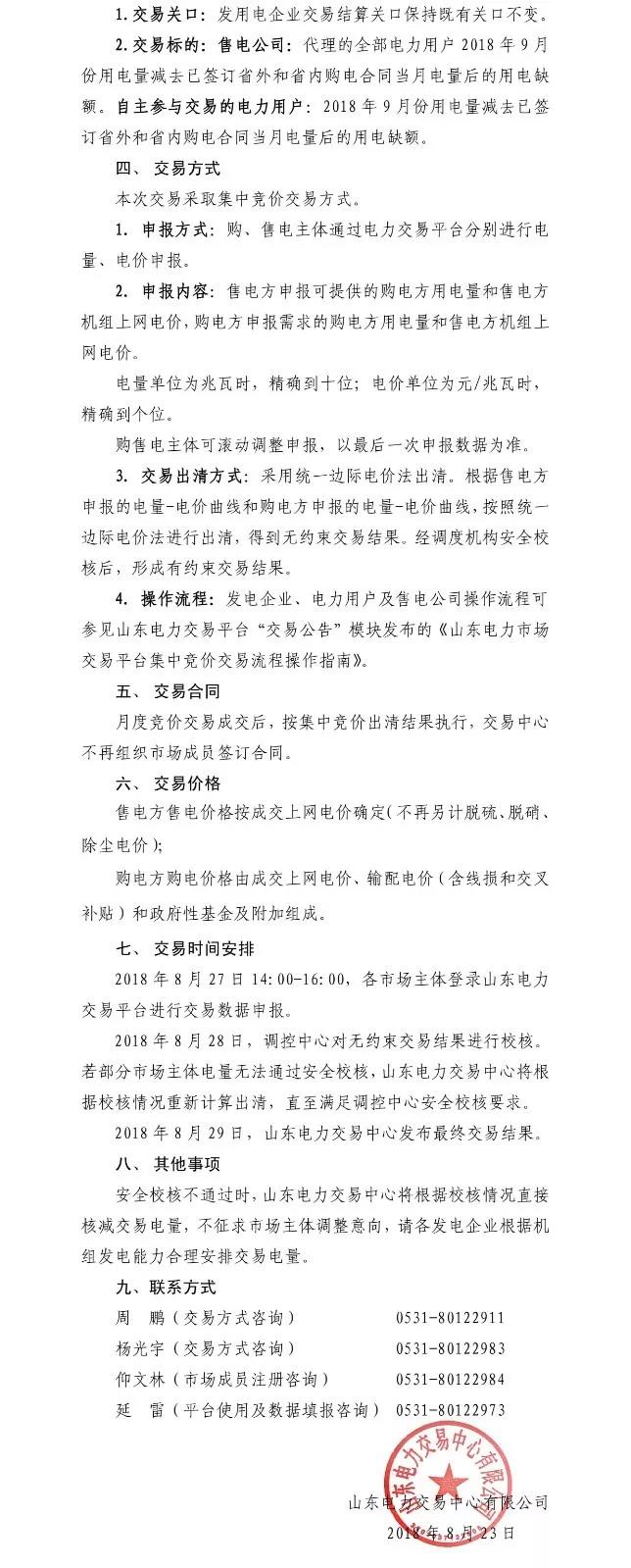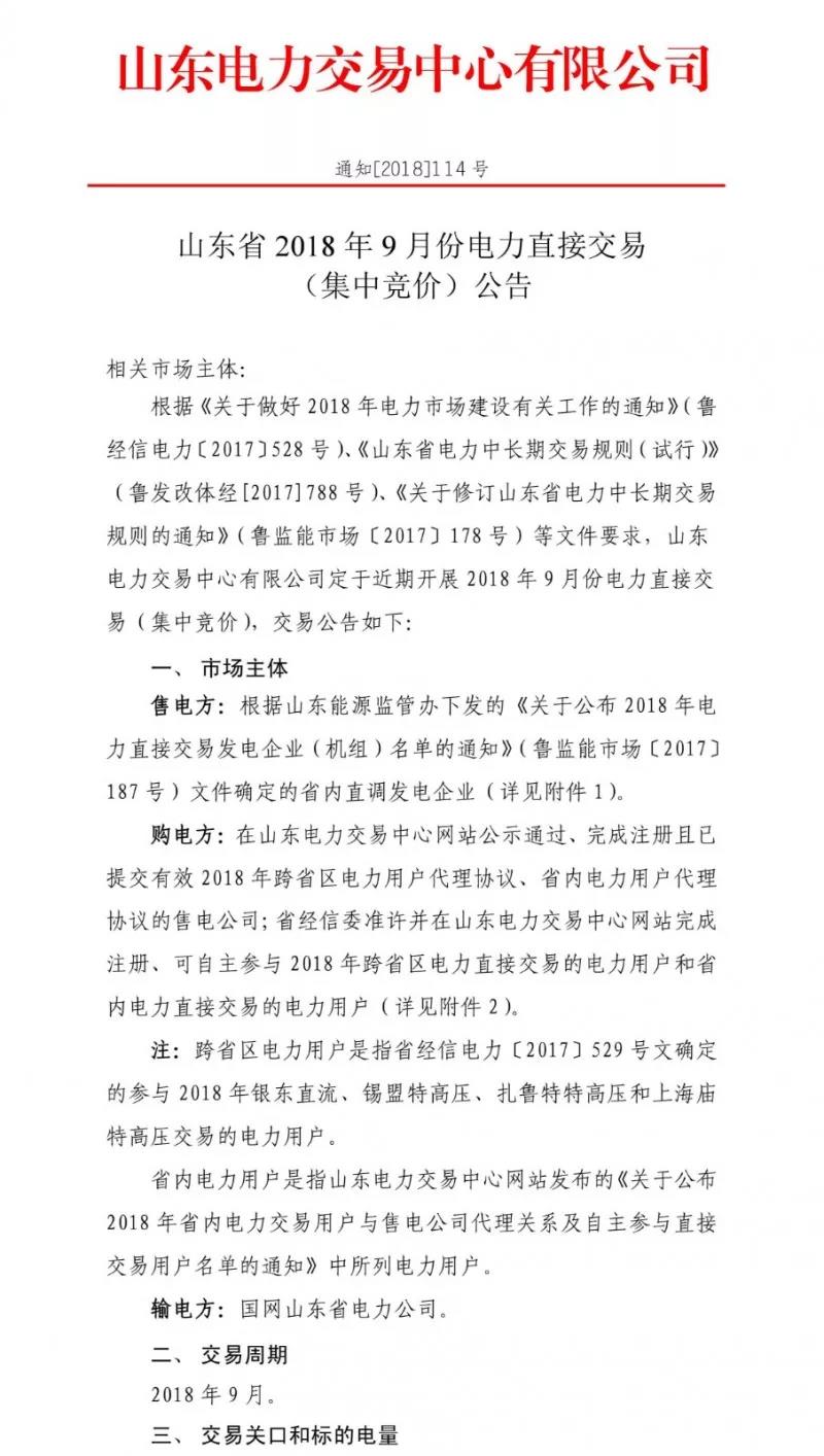 山東省2018年9月份電力直接交易 (集中競(jìng)價(jià))公告