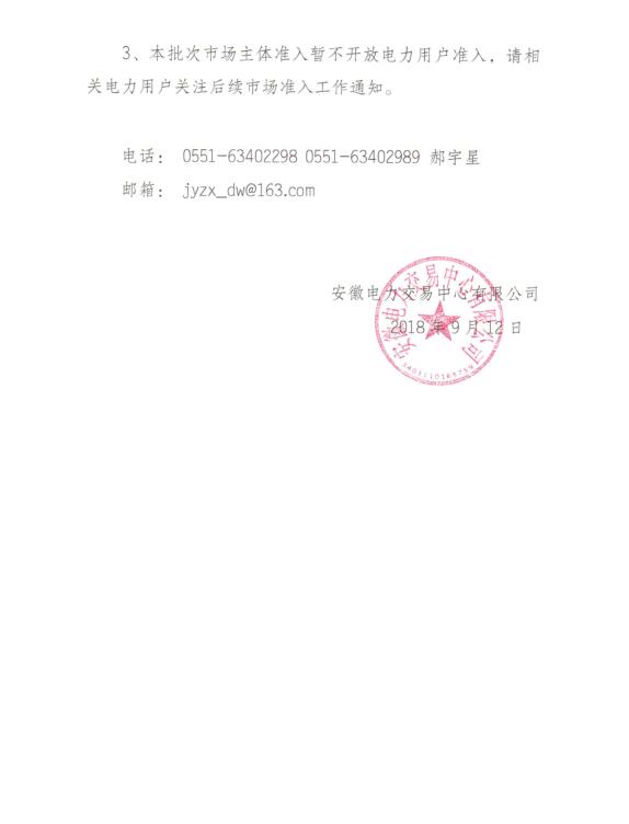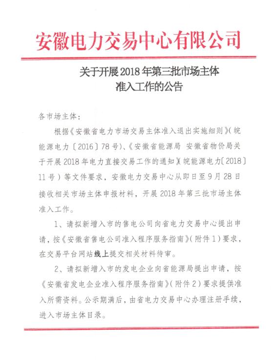 安徽電力交易中心今日發(fā)布了《關(guān)于開(kāi)展2018年第三批市場(chǎng)主體準(zhǔn)入工作的公告》,從即日至9月28日接收相關(guān)市場(chǎng)主體申報(bào)材料,開(kāi)展2018年第三批市場(chǎng)主體準(zhǔn)入工作。本批次暫不開(kāi)放電力用戶準(zhǔn)入。