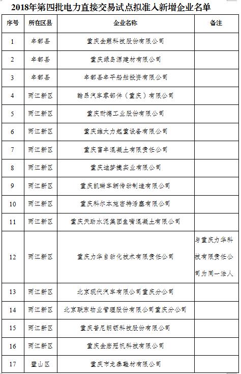 關(guān)于重慶市2018年第四批電力直接交易試點(diǎn)擬準(zhǔn)入新增企業(yè)名單的公示