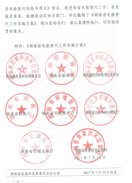 由湖南省發(fā)改委、湖南省能源局、湖南省經信委、湖南省財政廳、湖南省環(huán)境保護廳、湖南省住房和城鄉(xiāng)建設廳、湖南省交通運輸廳、湖南省質量技術監(jiān)督局八部委聯(lián)合下發(fā)的《湖南省電能替代工作實施方案》印發(fā)。