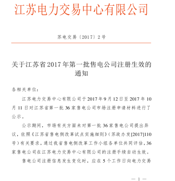 江蘇第一批36家售電公司成功入場!25家資產(chǎn)范圍2億!