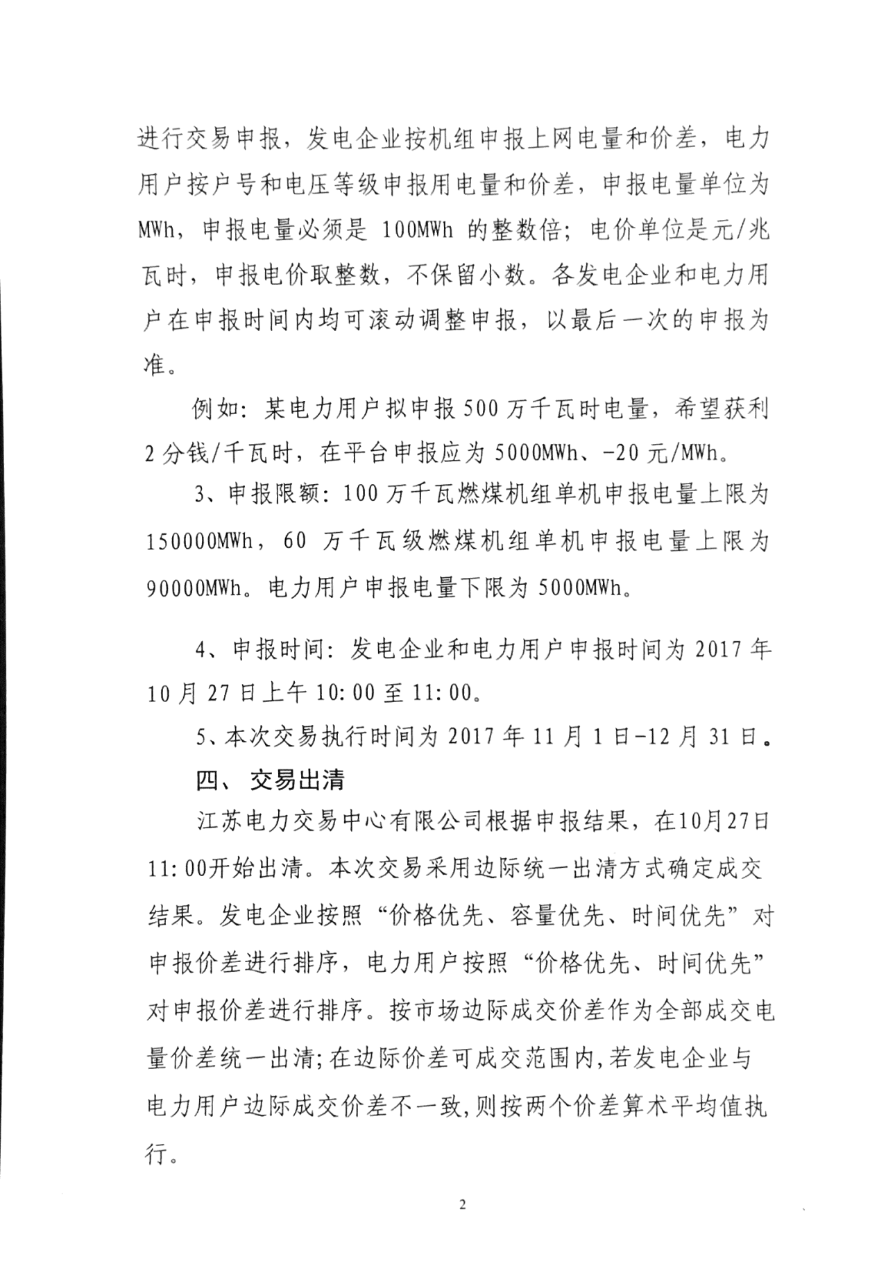 江蘇電力交易中心有限公司根據(jù)申報結(jié)果,在10月27日11:00開始出清、本次交易采用邊際統(tǒng)一出清方式確定成交結(jié)果。11至12月份集中競價電量需在12月31日之前執(zhí)行完畢。若11至12月份電力用戶累計實際用電量或發(fā)電企業(yè)累計實際上網(wǎng)電量低于集中競價交易成交電量,執(zhí)行3%偏差考核。