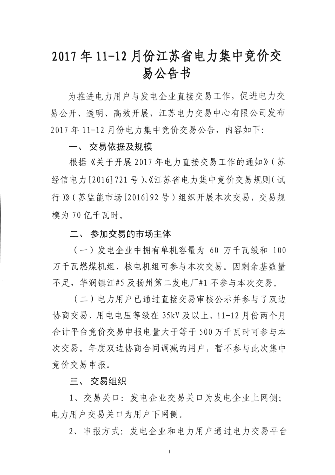 10月24日,江蘇電力交易中心公布了2017年11至12月份江蘇省電力集中競價交易公告書,交易規(guī)模為70億千瓦時,申報時間:發(fā)電企業(yè)和電力用戶申報時間為2017年10月27日上午10:00至11:00,本次交易執(zhí)行時間為2017年11