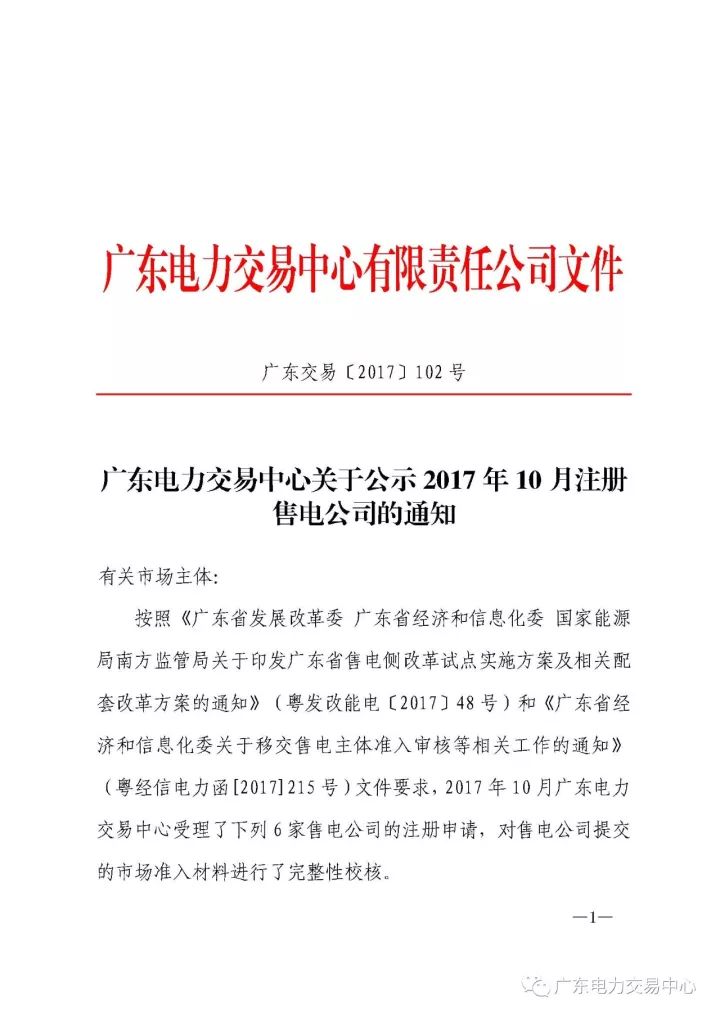 廣東電力交易中心日前發(fā)布了關(guān)于公示2017年10月注冊(cè)售電公司的通知,有6家售電公司在名單上。公示期為2017年11月5日至2017年12月4日。
