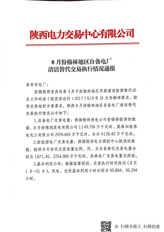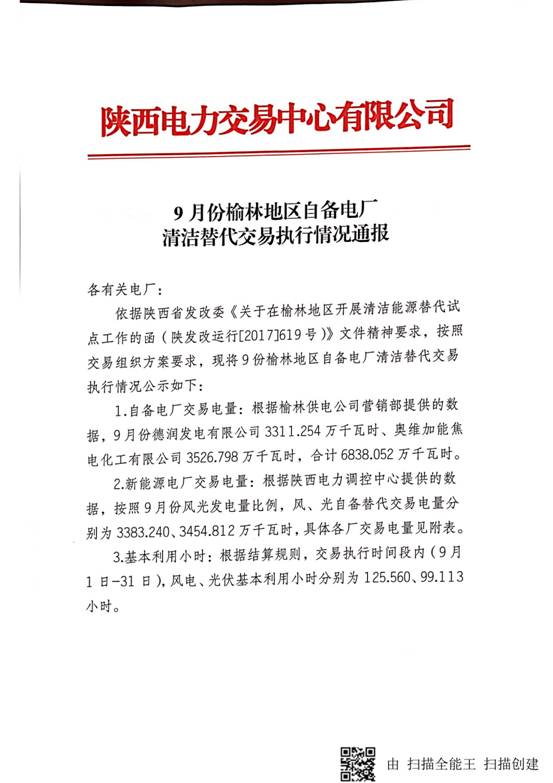《7、8、9月份榆林地區(qū)自備電廠清潔能源交易執(zhí)行情況通報》