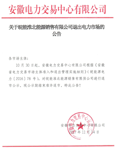 近日,安徽電力交易中心發(fā)布了《關于皖能淮北能源銷售有限公司退出電力市場的公告》,公告稱10月30日起,安徽電力交易中心有限公司根據(jù)《安徽省電力交易市場主體準入和退出管理實施細則》,對皖能淮北能源銷售有限公司退市公示,現(xiàn)公示期結束準許退市。