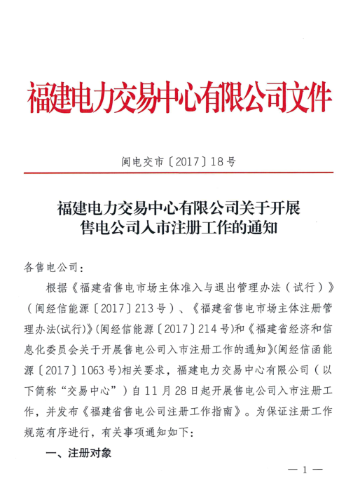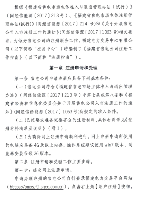 福建電力交易中心11月28日發(fā)布了《關(guān)于開展售電公司入市注冊(cè)工作的通知》,通知中稱,自11月28日起開展售電公司入市注冊(cè)工作,欲納入首批注冊(cè)名單的售電公司應(yīng)于12月6日之內(nèi)完成網(wǎng)上注冊(cè)申請(qǐng)工作。并發(fā)布《福建省售電公司注冊(cè)工作指南》。詳情如下: