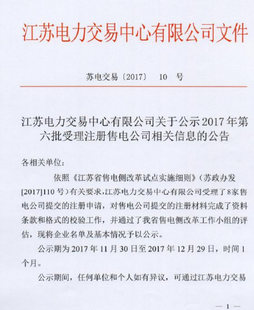 近日,江蘇電力交易中心發(fā)布了《關(guān)于2017年第六批受理注冊(cè)售電公司相關(guān)信息的公告》,公告稱對(duì)第六批8家售電公司進(jìn)行了受理公示,公示期為11月30日至12月29日。