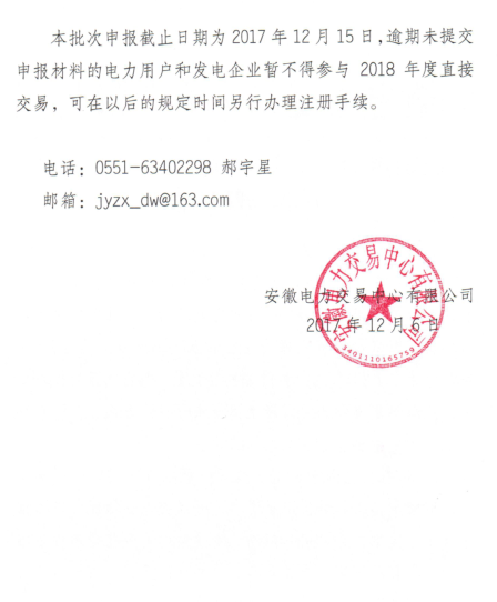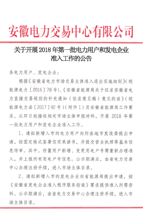 安徽2018年第一批電力用戶和發(fā)電企業(yè)準(zhǔn)入開始申報