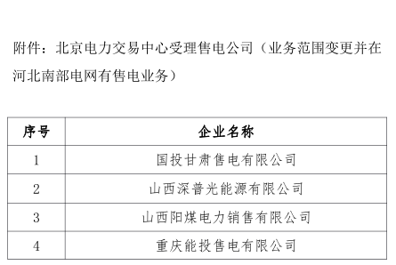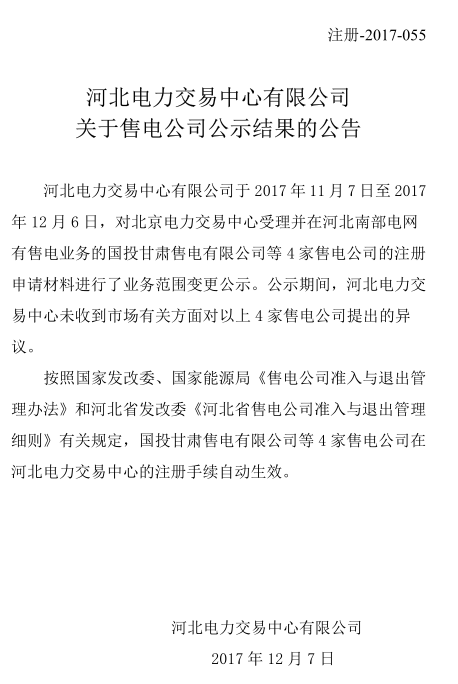 河北電力交易中心日前發(fā)布了關(guān)于售電公司公示結(jié)果的公告,公告中稱,國投甘肅售電有限公司等4家售電公司在河北電力交易中心的注冊手續(xù)自動(dòng)生效。