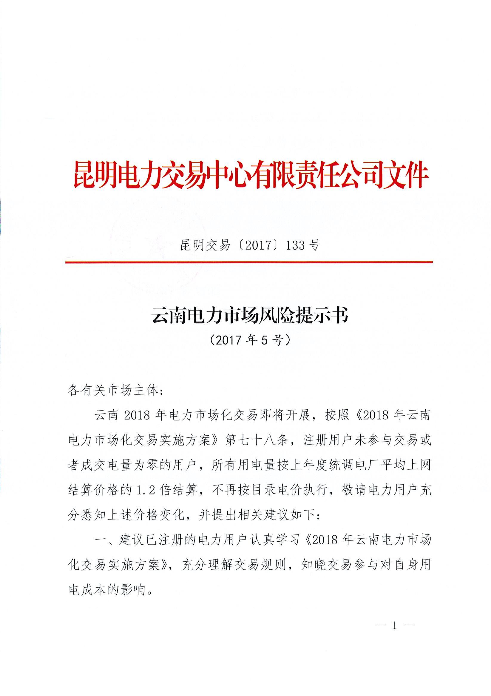 昆明電力交易中心日前發(fā)布了云南電力市場風險提示書,其中提到云南2018年電力市場化交易即將開展,注冊用戶未參與交易或者成交電量為零的用戶,所有用電量按上年度統(tǒng)調(diào)電廠平均上網(wǎng)結(jié)算價格的1 2倍結(jié)逄,不再按目