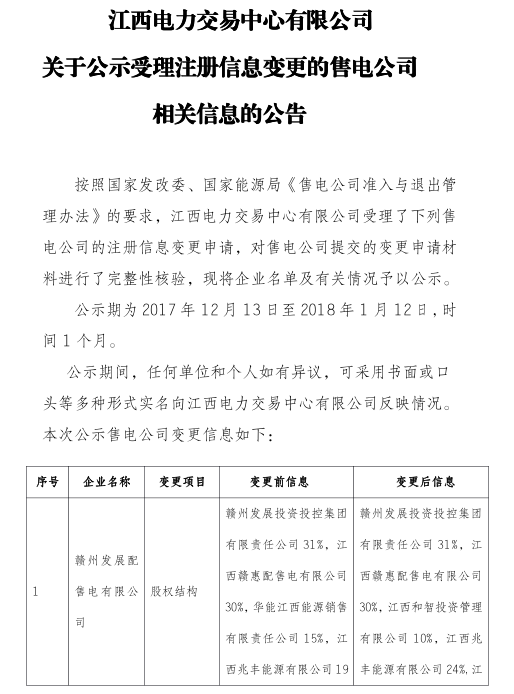 江西電力交易中心日前發(fā)布了關(guān)于公示受理注冊信息變更的售電公司相關(guān)信息的公告,有1家售電公司因股權(quán)結(jié)構(gòu)及從業(yè)人員變更進(jìn)行公示,公示期為2017年12月13日至2018年1月12日。詳情如下: