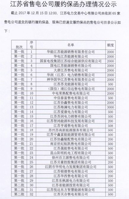 江蘇電力交易中心12月15日下午發(fā)布了江蘇省售電公司履約保函辦理情況公示,截止2017年12月15日12:00,江蘇電力交易中心有限公司共收到65家售電公司遞交的履約保函。