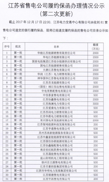 江蘇電力交易中心12月17日發(fā)布了第二次更新的江蘇省售電公司履約保函辦理情況公示,截止2017年12月17日22:00,江蘇電力交易中心共收到81家售電公司遞交的銀行履約保函。