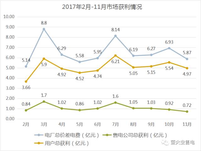 2017年2-11月,電廠總價(jià)差電費(fèi)65.16億元,其中長(zhǎng)協(xié)價(jià)差電費(fèi)44.32億元,競(jìng)價(jià)價(jià)差電費(fèi)20.15億元。售電公司總獲利10.76億元,用戶總獲利50.66億元。