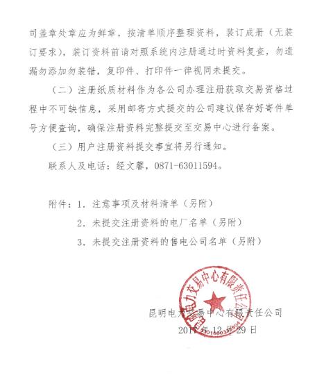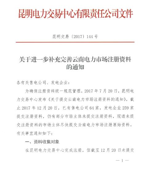 2018年1月1日,昆明電力交易中心發(fā)布《關(guān)于進一步補充完善云南電力市場注冊資料的通知》。為確保注冊資料統(tǒng)一規(guī)范管理,2017年7月20日,昆明電力交易中心發(fā)布《關(guān)于提交云南電力市場注冊資料的通知》。截止2017年