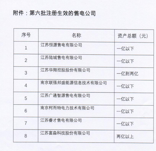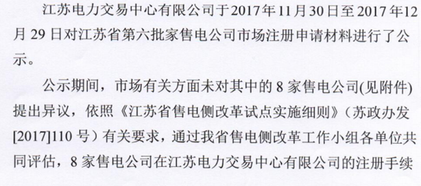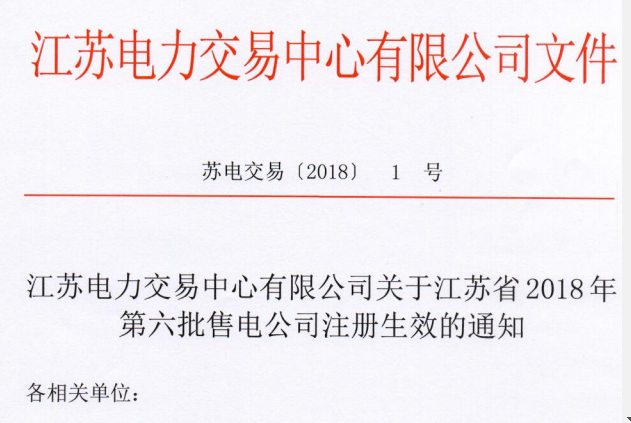 江蘇電力交易中心日前發(fā)布《關于江蘇省2018年第六批售電公司注冊生效的通知》,通知表示江蘇電力交易中心于2017年11月30日至2017年12月29日對江蘇省第六批售電公司市場注冊申請材料進行了公示。公示期間,市場有關方面未對其中的8家售電公司提出異議,依照《江蘇省售電側改革試點實施細則》有關要求,通過江蘇省售電側改革工作小組各單位共同評估,8家售電公司在江蘇電力交易中心有限公司的注冊手續(xù)自動生效原文如下: