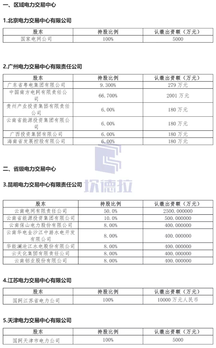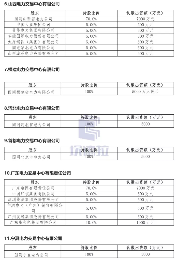 (1)2個區(qū)域性電力交易中心,一個是國家電網(wǎng)100%控股,一個是南方電網(wǎng)占66.7%、其他5方占33.3%。