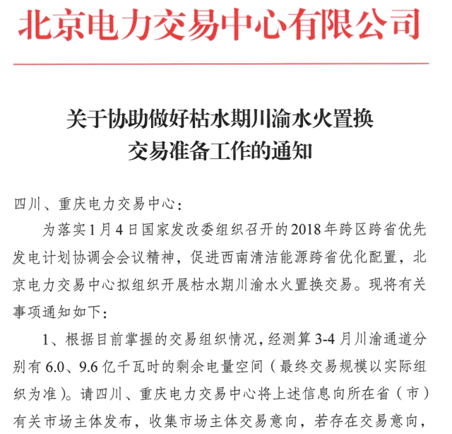四川電力交易中心發(fā)布《關(guān)于協(xié)助做好枯水期川渝水火置換交易準(zhǔn)備工作的通知》,文中指出,為落實(shí)1月4日國(guó)家發(fā)改委組織召開(kāi)的2018年跨區(qū)跨省