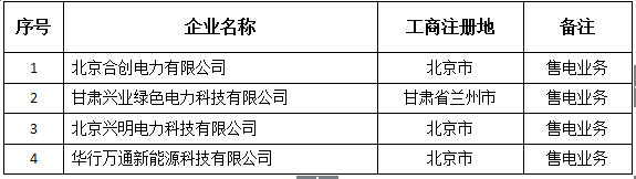 按照國(guó)家發(fā)改委、國(guó)家能源局《售電公司準(zhǔn)入與退出管理辦法》(發(fā)改經(jīng)體〔2016〕2120號(hào))的要求,青海電力交易中心有限公司受理了北京電力交易中心有限公司推送的北京合創(chuàng)電力有限公司等4家售電公司的市場(chǎng)注冊(cè)申請(qǐng),現(xiàn)將企業(yè)名單及基本情況予以公示。