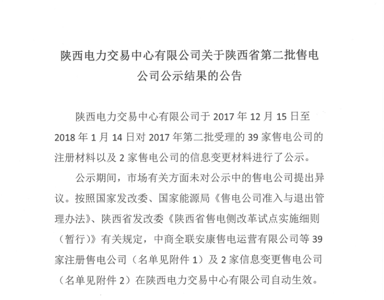 《陜西電力交易中心有限公司關(guān)于陜西省第二批售電公司公示結(jié)果的公告》