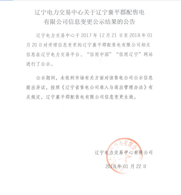 《遼寧電力交易中心關(guān)于遼寧襄平郡配售電有限公司信息變更公示結(jié)果的公告》