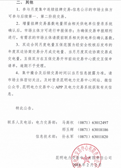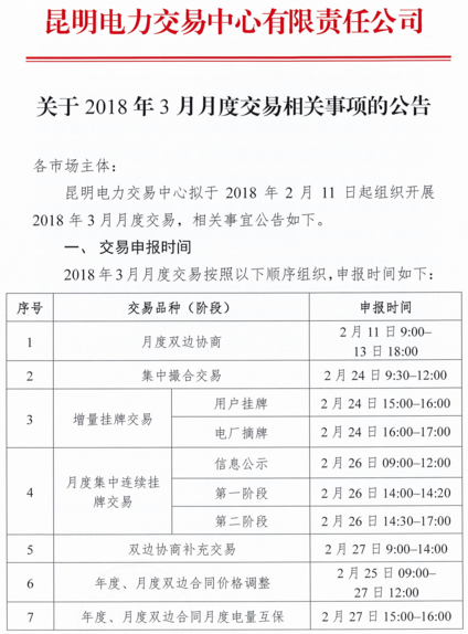 昆明電力交易中心日前發(fā)布了《關(guān)于2018年3月月度交易相關(guān)事項的公告》,昆明電力交易中心擬于2月11日起組織開展2018年3月月度交易,詳情如下: