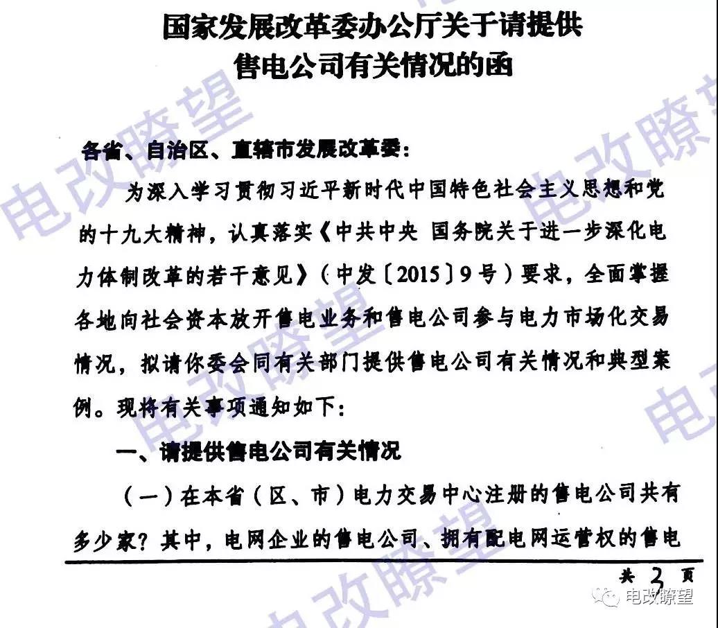 據(jù)電改瞭望微信號,國家發(fā)改委辦公廳日前發(fā)布了《關(guān)于請?zhí)峁┦垭姽居嘘P(guān)情況的函》,要求提供在本省電力交易中心注冊的售電公司共有多少家?2017年交易量是多少?售電公司不能在電力交易中心自主注冊或無法開展售電業(yè)務(wù)的,需說明原因,并提出落實(shí)改革要求的具體措施和時間表。
