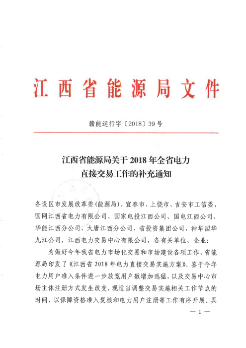 江西2018年全省電力直接交易工作的補充通知