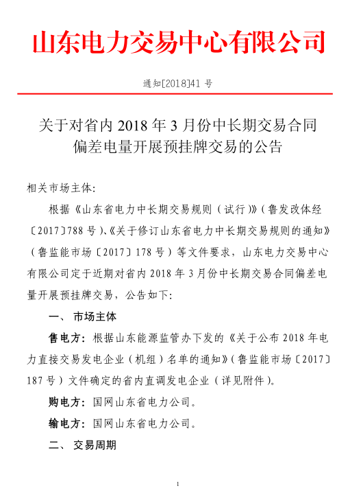 山東電力交易中心日前發(fā)布了《關(guān)于對省內(nèi)2018年3月份中長期交易合同偏差電量開展預(yù)掛牌交易的公告》。