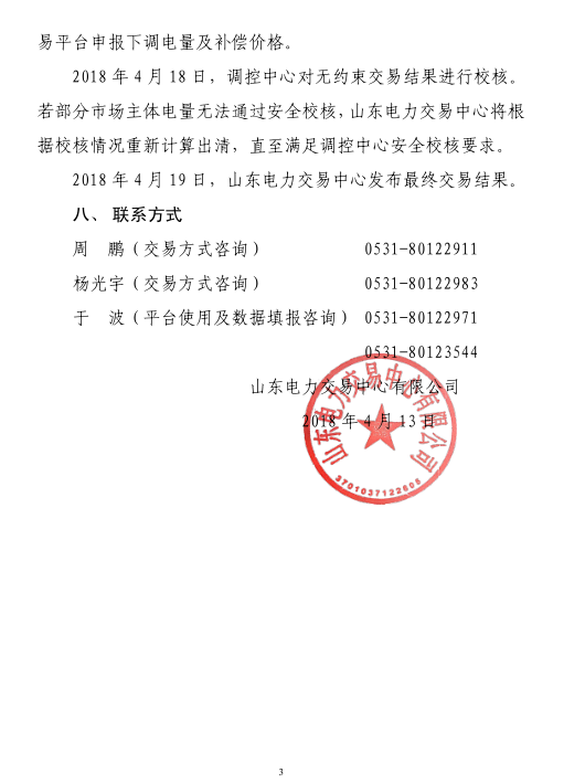 2018年4月19日,山東電力交易中心發(fā)布最終交易結(jié)果。