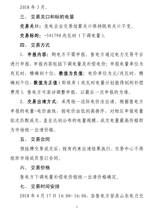 2018年4月17日14:00~16:00,各售電方登錄山東電力交易平臺(tái)申報(bào)下調(diào)電量及補(bǔ)償價(jià)格。