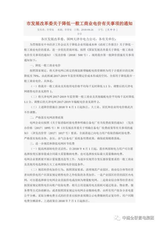 2018年4月26日,天津市發(fā)改委公布了《關(guān)于降低一般工商業(yè)電價有關(guān)事項的通知》。