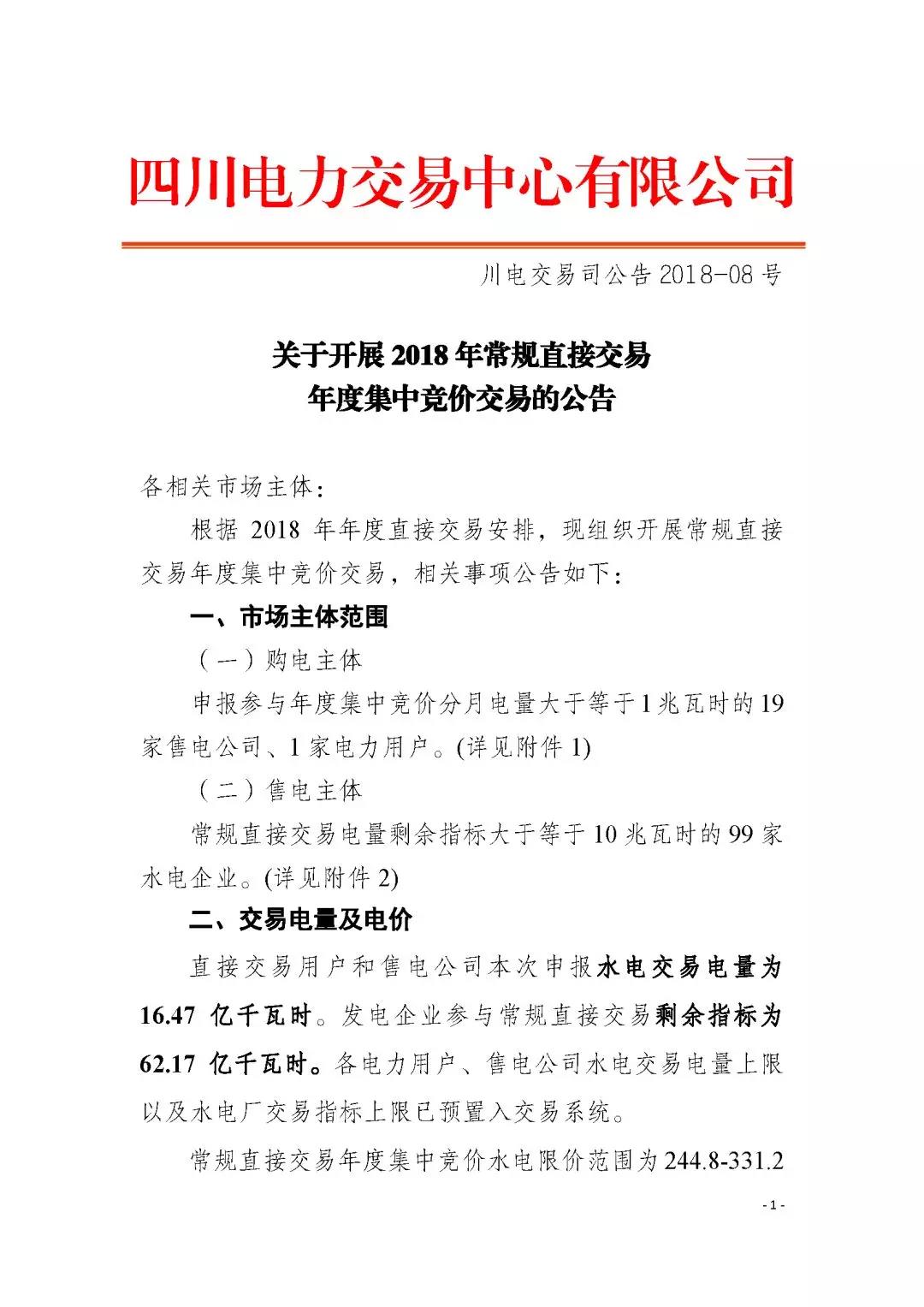 四川電力交易中心日前發(fā)布了《關(guān)于開展2018年常規(guī)直接交易年度集中競價交易的公告》,購電主體:申報參與年度集中競價分月電量大于等于1兆