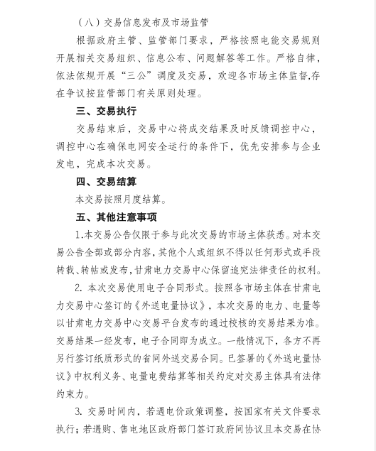 甘肅電力交易中心日前發(fā)布了《2018年6月甘肅送江西月度省間外送交易公告》,本次交易電量:1.1億千瓦時(shí)。( 實(shí)際成交電量以校核通過結(jié)果為準(zhǔn), 并根據(jù)電網(wǎng)運(yùn)行情況和甘肅新能源發(fā)電情況調(diào)整。)交易執(zhí)行周期:2018 年6月8日至2018年6月30日。交易電價(jià):電廠上網(wǎng)結(jié)算電價(jià)為178. 8元/ 千千瓦時(shí)。本次交易的成交電量,均在各市場(chǎng)主體其它電量成分上疊加執(zhí)行; 當(dāng)實(shí)際交易電量與公告的計(jì)劃交易電量有偏差時(shí) ,各市場(chǎng)主體實(shí)際交易電量按照出清結(jié)果等比例調(diào)增或調(diào)減。詳情如下: