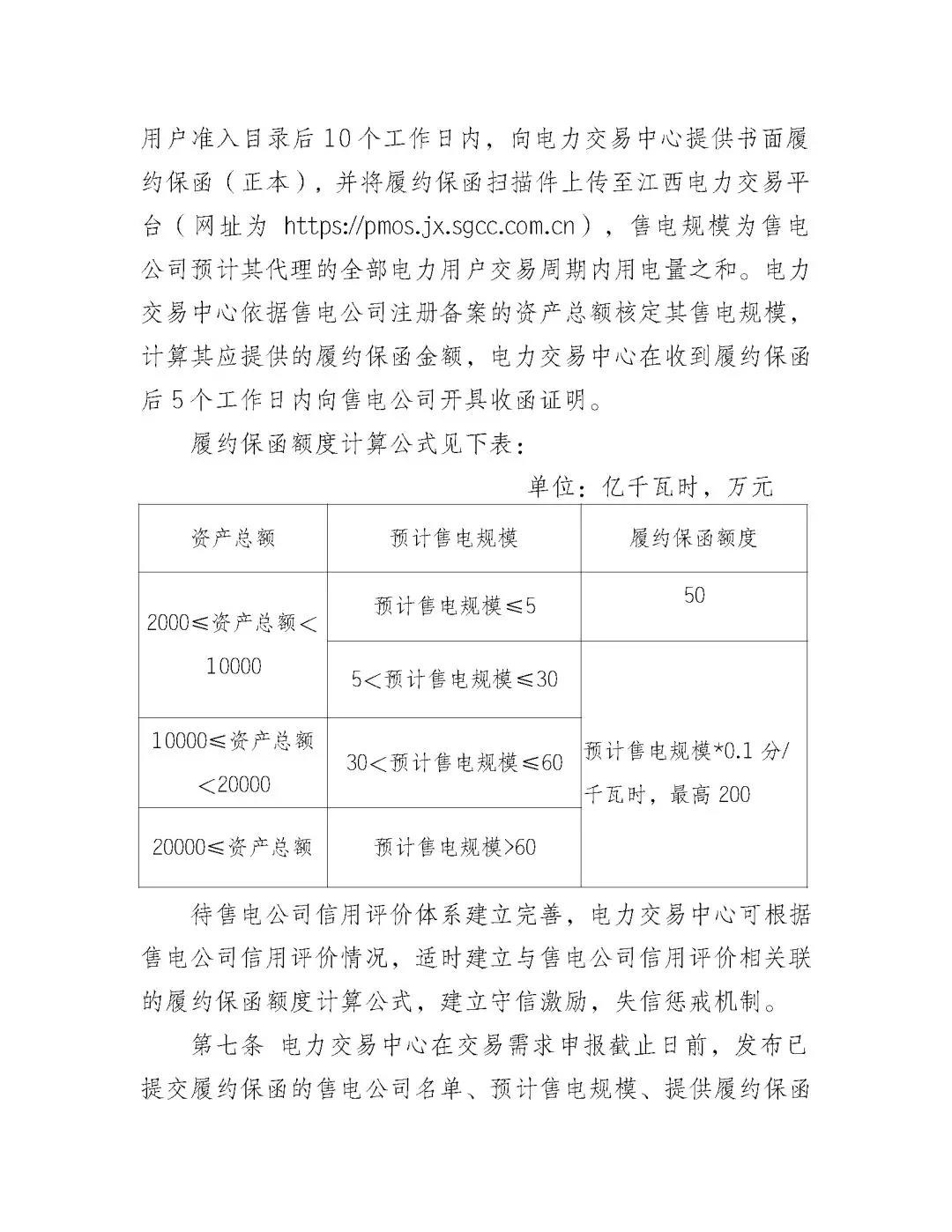 江西的履約保函額度最低僅為50萬元,預計售電規(guī)模*0.1分/千瓦時,最高200萬元。當售電公司申報交易電量超過其預先申報的年售電規(guī)模時,售電公司應按要求及時補足相應的保函額度。