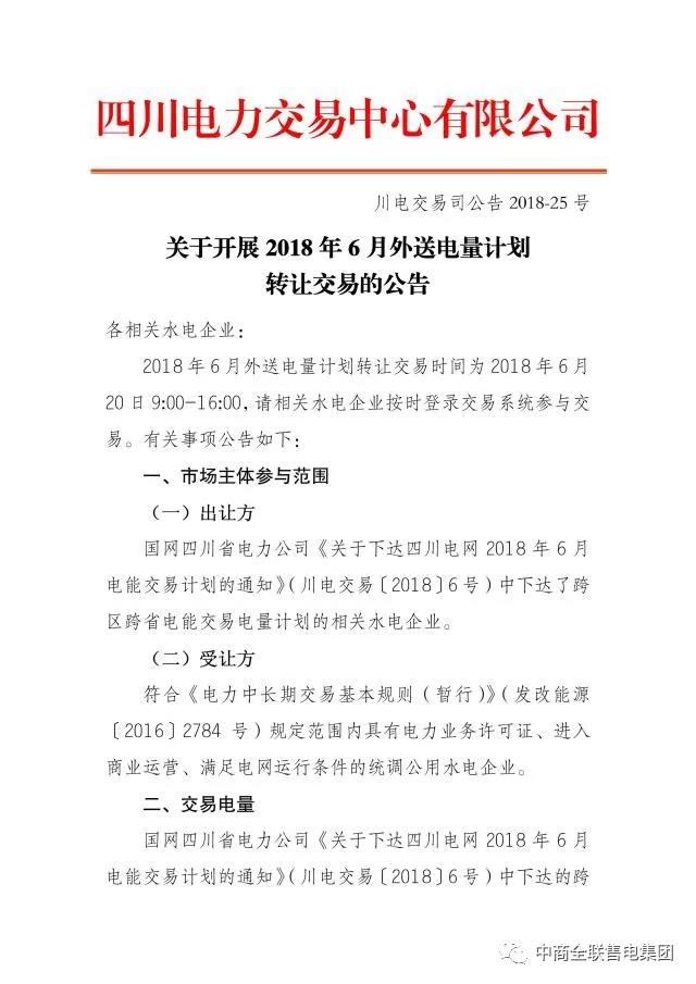 2018年6月15日,四川電力交易中心有限公司發(fā)布了《關(guān)于開(kāi)展2018年6月外送電量計(jì)劃轉(zhuǎn)讓交易的公告》。