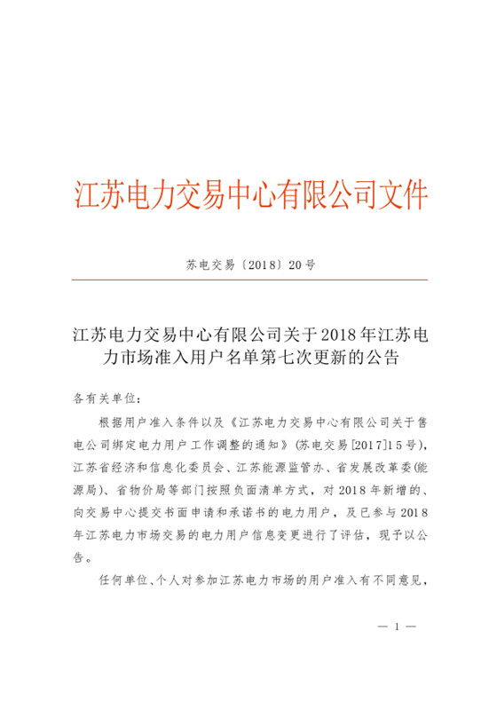 江蘇電力交易中心日前發(fā)布了《關(guān)于2018年江蘇電力市場準入用戶名單第七次更新的公告》,共19家電力用戶獲準入。詳情如下: