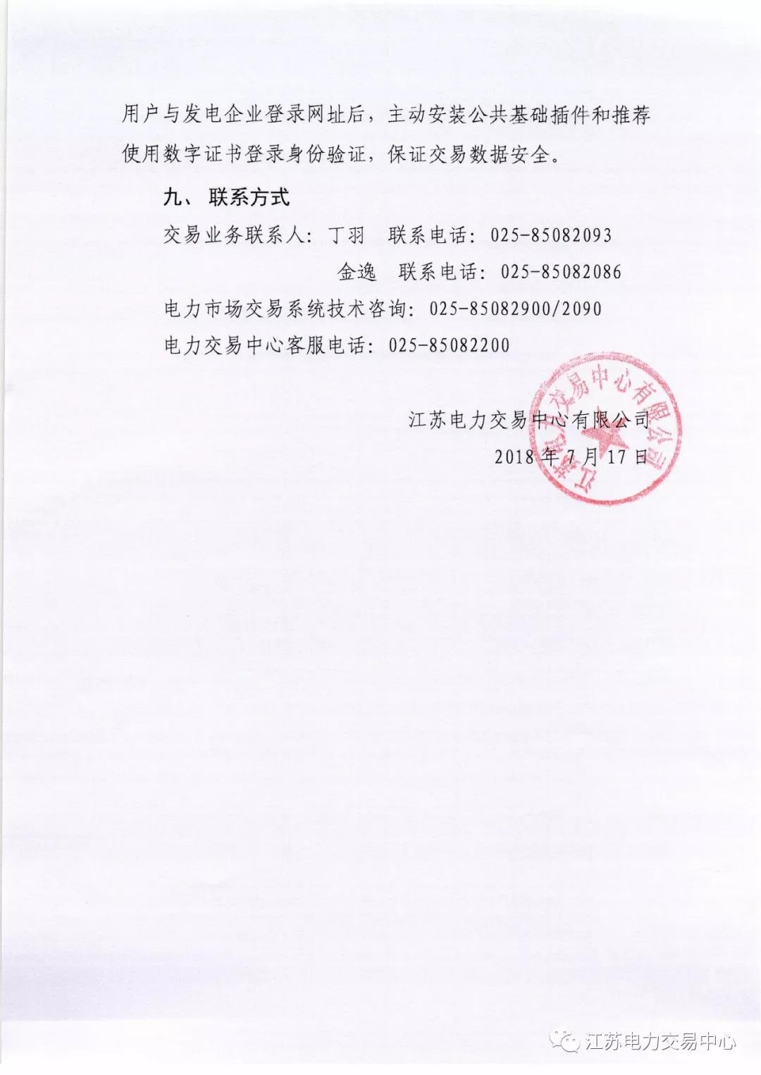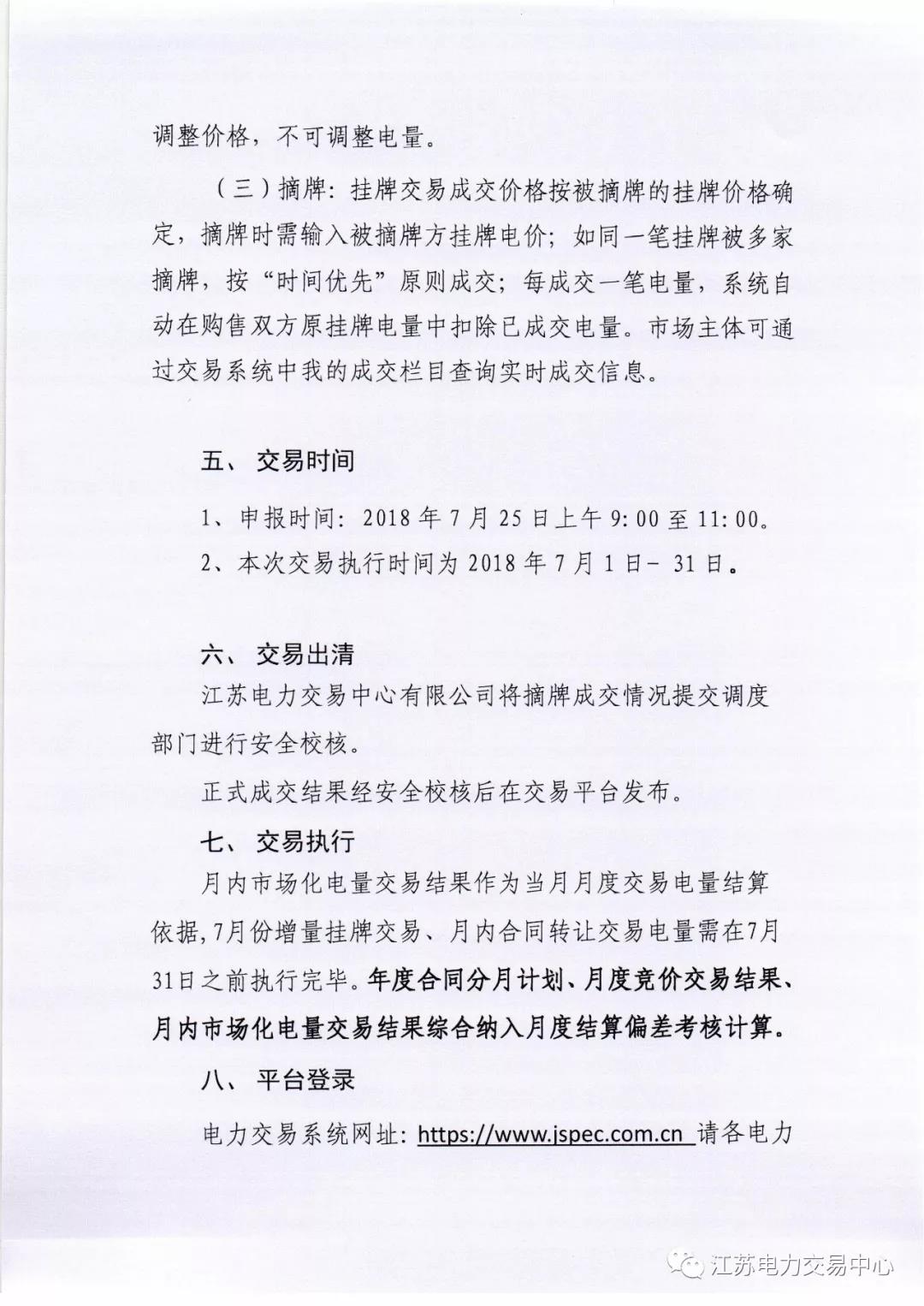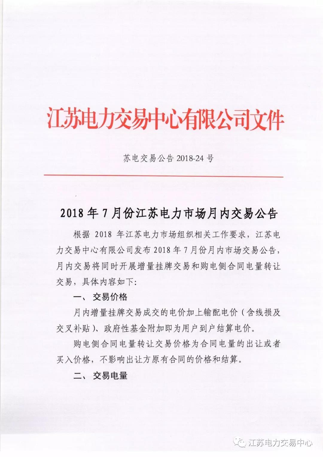 2018年7月份江蘇電力市場月內交易公告