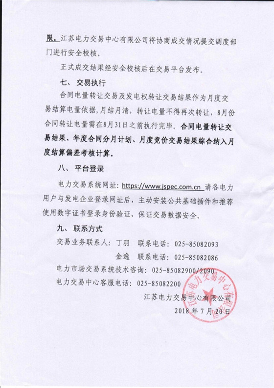江蘇2018年8月份發(fā)電企業(yè)合同電量轉(zhuǎn)讓及發(fā)電權(quán)交易