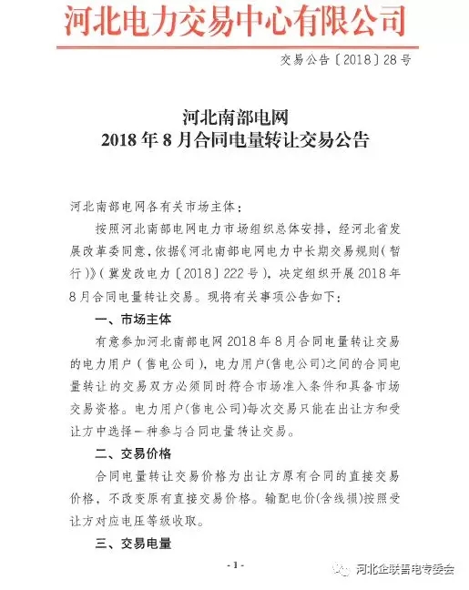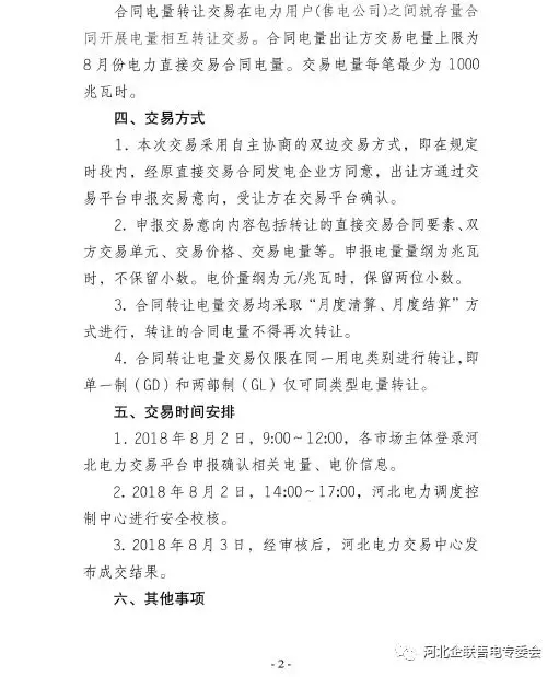 河北南部電網(wǎng)2018年8月份合同電量轉(zhuǎn)讓交易:于8月2日9時展開