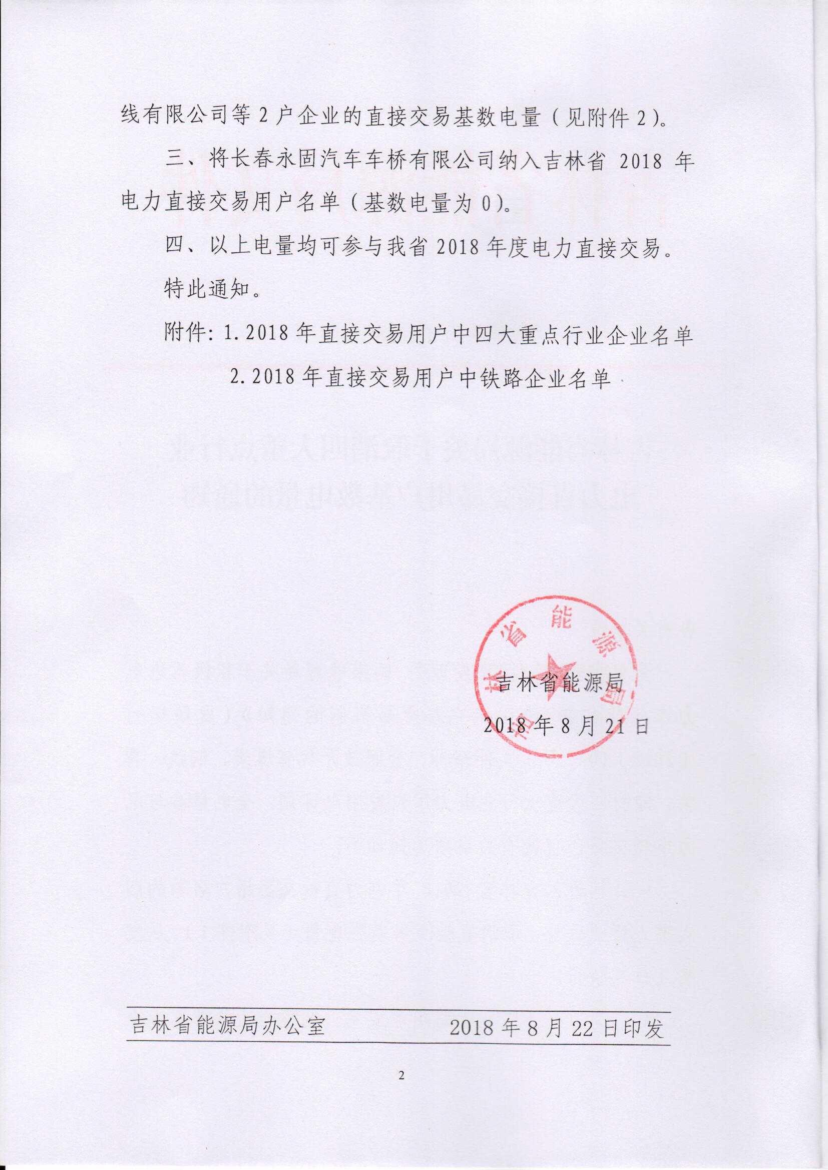將長(zhǎng)春永固汽車(chē)車(chē)橋有限公司納入吉林省2018年電力直接交易用戶名單(基數(shù)電量為0)。詳情如下: