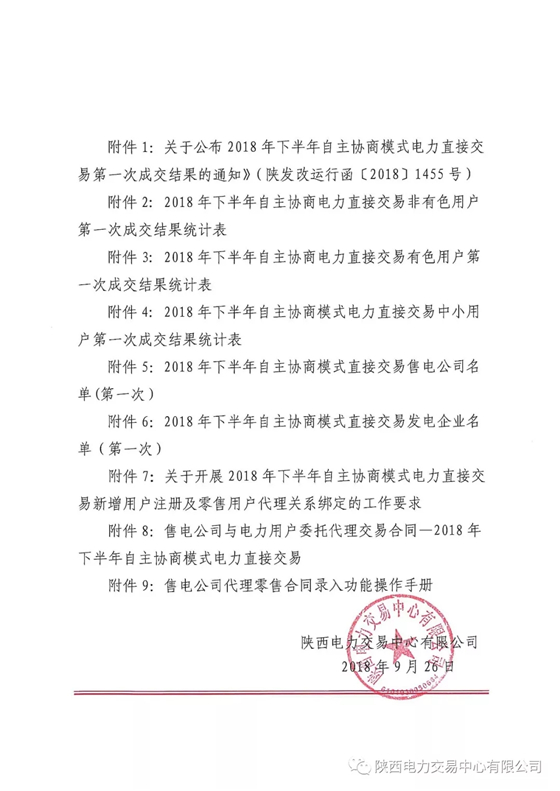 陜西電力交易中心日前發(fā)布了《關(guān)于開展陜西省2018年下半年自主協(xié)商模式第一次電力直接交易的通知》,市場(chǎng)主體:1.購(gòu)電方:已在《關(guān)于公布2018年下半年自主協(xié)商模式電力直接交易第一次成交結(jié)果的通知》(陜發(fā)改運(yùn)行函〔2018〕1455號(hào))中公示的非有色行業(yè)339家電力大用戶(見附件2)、有色行業(yè)29家電力大用戶(見附件3)、363家中小用戶(見附件4)和代零售用戶參與交易的45家售電公司(見附件5);2.售電方:已在《關(guān)于公布2018年下半年自主協(xié)商模式電力直接交易第一次成交結(jié)果的通知》(陜發(fā)改運(yùn)行函〔2018〕1455號(hào))中公示的參與本次直接交易的20家發(fā)電企業(yè)(見附件6);3.輸電方:國(guó)網(wǎng)陜西省電力公司、陜西地方電力(集團(tuán))公司。4. 電力用戶(包含大用戶和中小用戶):電力用戶及售電公司于9月30日前登錄交易平臺(tái)完成新增用戶注冊(cè)及零售用戶代理關(guān)系綁定確認(rèn)工作(老用戶不需再次注冊(cè),見附件7)。