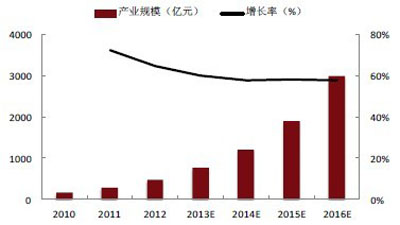 圖1:2010-2016年中國云計算產(chǎn)業(yè)規(guī)模及預測(億元)