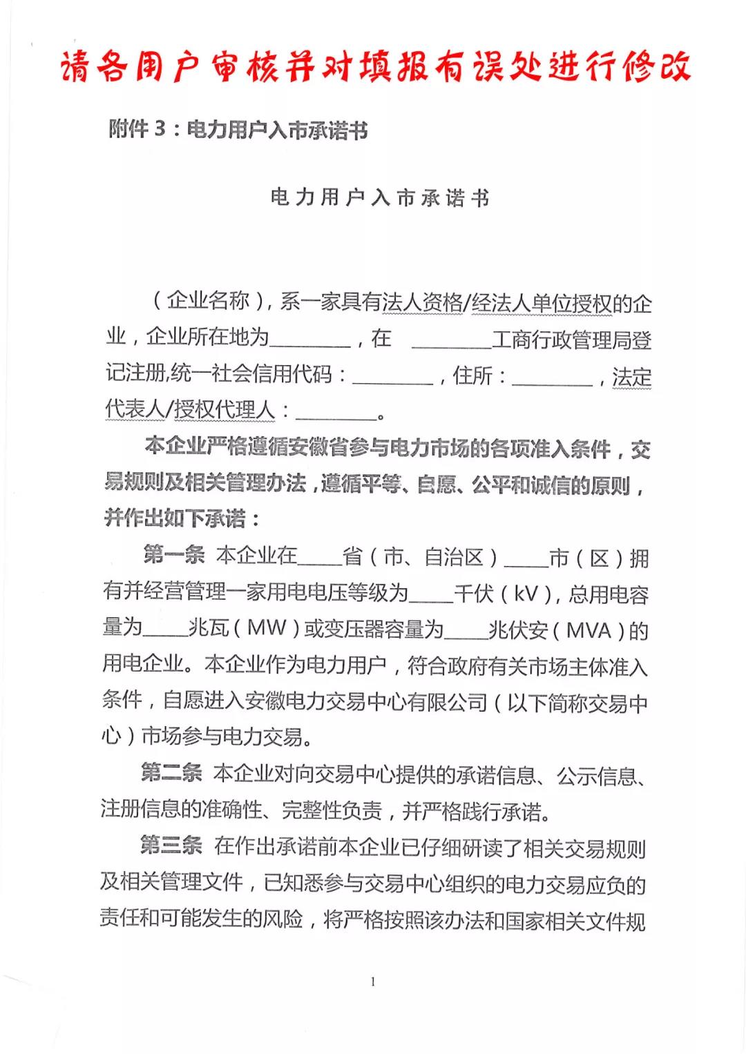 為減輕企業(yè)申報(bào)負(fù)擔(dān),現(xiàn)本公司對(duì)電力用戶《附件2:申請(qǐng)書、附件3:電力用戶入市承諾書、附件4:交易平臺(tái)使用協(xié)議》信息進(jìn)行初步填寫工作。并將已填寫附件發(fā)至各電力用戶,請(qǐng)各用戶審核,并對(duì)填報(bào)有誤處進(jìn)行修改。