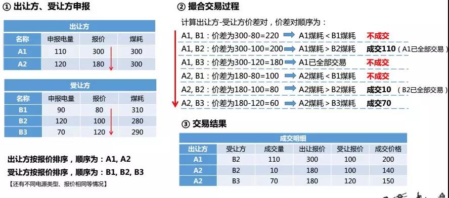 如下圖交易撮合過程所示,實際的發(fā)電合同電量轉(zhuǎn)讓高低匹配出清是在充分考慮節(jié)能減排原則的基礎(chǔ)上的出讓、受讓雙方的循環(huán)配對出清,而不是簡單的集中競價中的高低匹配出清。