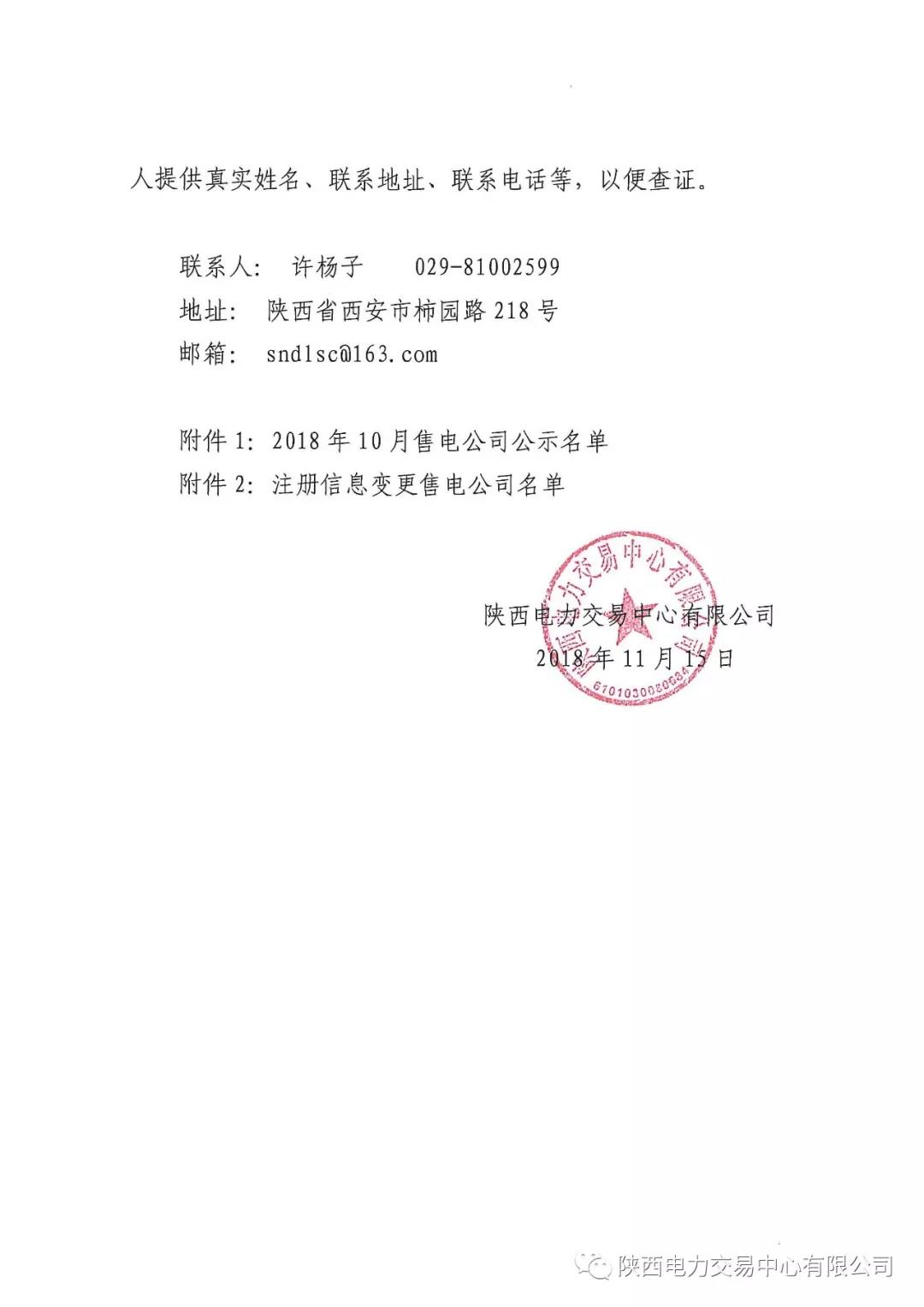 陜西電力交易中心有限公司關于公示2018年10月受理注冊及信息變更的售電公司相關信息的公告