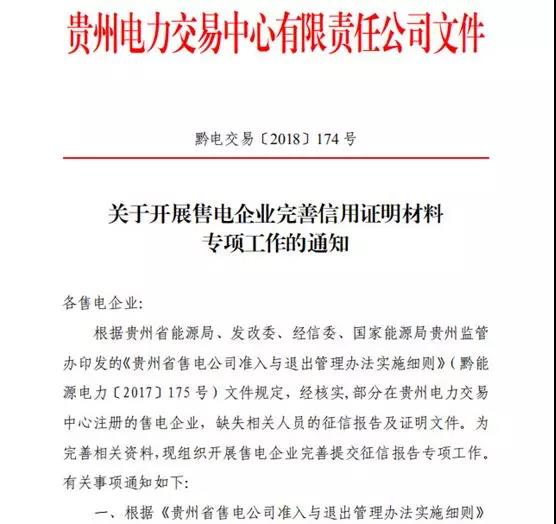 貴州發(fā)布了《關(guān)于開展售電企業(yè)完善信用證明材料專項工作的通知》